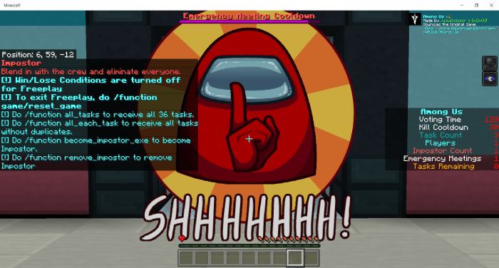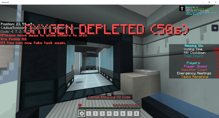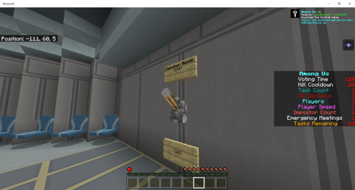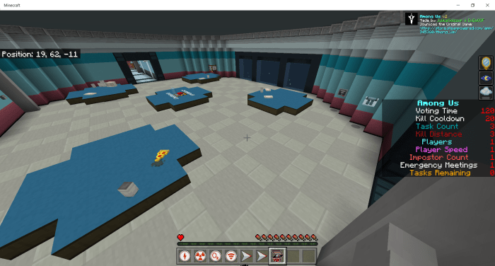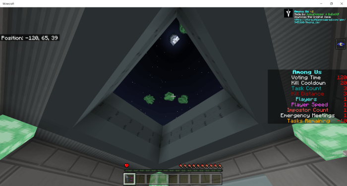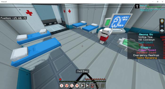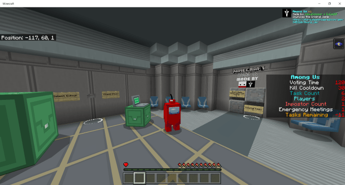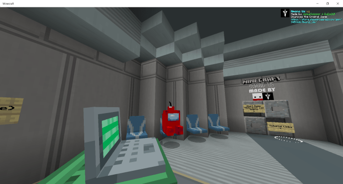 Harita Aramızda, yalnızca Minecraft dünyasının açık alanlarında bulunan popüler sınava üye olmak için bir fırsattır. Orijinal oyunda bulunan uzay istasyonunun tüm konumlarını kesinlikle yeniden yaratmaya çalıştığı ve ayrıca montajda oynamanız gereken ilginç mini oyunları da dahil ettiği için bu eklentinin yazarına itibar etmeye değer.. Bu oyunların geçilmesi, karşı takıma karşı galibiyetin kazanılmasında önemli bir etken olacaktır.