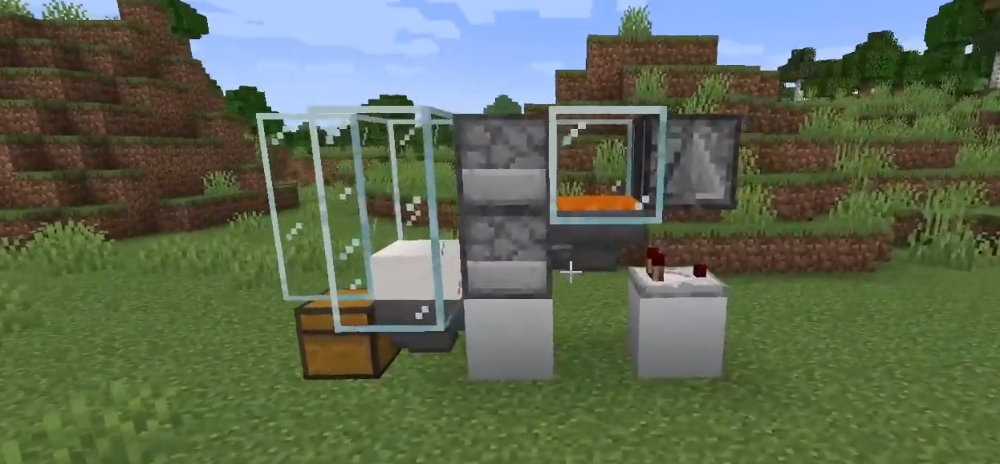 Burada karmaşık bir şey yok, ama her detay önemli. Sandığı yerleştiriyoruz — bu sizin mini buzdolabınız olacak. Ona bir huni bağlıyoruz (unutmayın, huninin “ucu” doğrudan sandığa bakmalı, aksi takdirde “ürün kaybı” yaşanır). Üstüne yarım blok koyuyoruz — düşen ganimetin toplanacağı ızgara masamız.