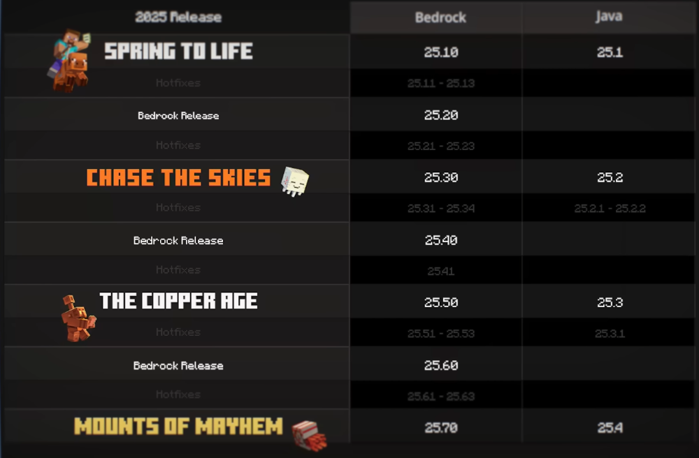 Uzun bir süre boyunca Minecraft, klasik bir şemaya bağlı kaldı: bir ana sürüm (örneğin, 1.21) ve ardından gelen küçük yamalar (1.21.1, 1.21.2 vb.). Bu sistem, büyük güncellemelerin genellikle yaz aylarında yılda bir kez çıktığı zamanlarda oldukça iyi çalışıyordu.