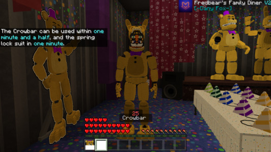 Mod Fredbear'ın Aile Lokantası 1983 - en sevdiğiniz animatroniklere yeni bir bakış. Fredbear's Pizzeria, Five Nights at Freddy's'in birkaç bölümünün ana ortamı olan kompakt bir kuruluştur. Bu değişikliğin benzer eklentilerden bazı farklılıkları vardır. Bu düzeneğin ana avantajı, bebekleri etkileyici bir mesafeden uzaktan kontrol etme yeteneğidir. Rol yapma hikayelerinizi oluşturun ve popüler karakterlerle oyunda ilerleyin.