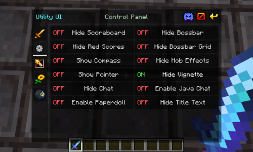 Geniş arayüz özelleştirmesi dokuları, Minecraft'ta bazı oyun pencerelerini ve simgelerini optimize eden estetik bir eklentidir. Arayüzü daha da geliştirmek, gereksiz seçenekleri kaldırmak ve yeni ayarlar eklemek istiyorsanız, bu araç kesinlikle vazgeçilmezdir. Ayrıca oynanış açısından ek fırsatlar açacaksınız.