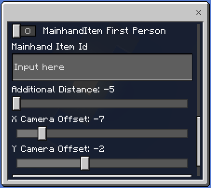 - Main hand Item First Person & Id - the use of tools or weapons is accompanied by an automatic change in the camera angle.