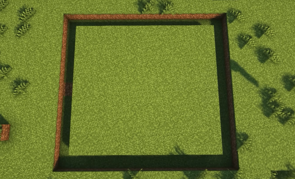 In the very center of the area — a 2-block hole for the dispenser. I let it “grab” a dirt block, buried it, and rejoiced: on the surface, it looks like a regular meadow, but underneath lies a true mechanical marvel!