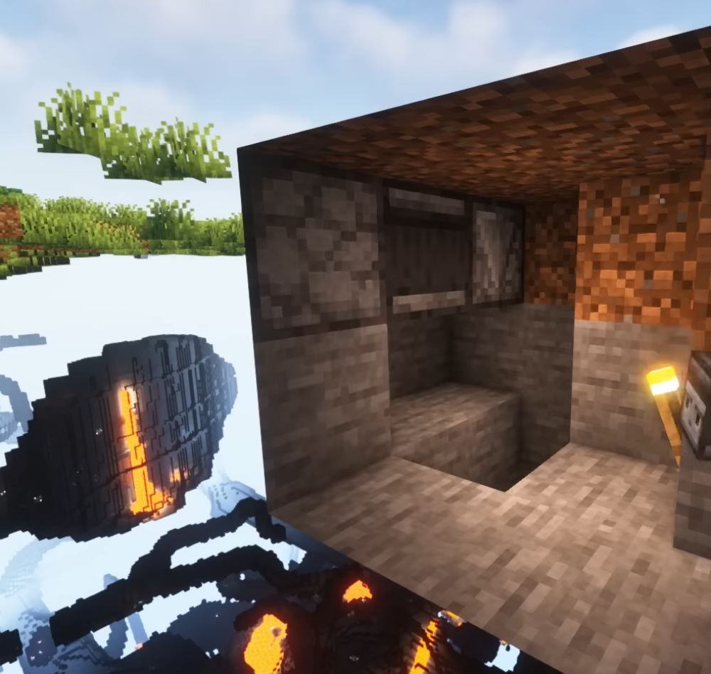 A tunnel and a “secret room” for the observers (I love building hidden corners!). Chain the hoppers to the chest — the entire harvest goes exactly where it should. The system is as reliable as a Swiss watch.