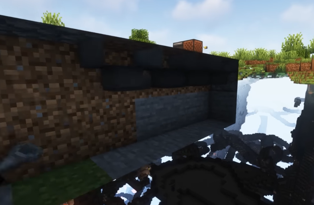 On the long side, dig 9 blocks, and that’s where the pistons go (one of those cases where “the more, the merrier”). Behind them, lay down redstone. Attach note blocks and observers on the edges — and voilà, the mechanism already feels alive!