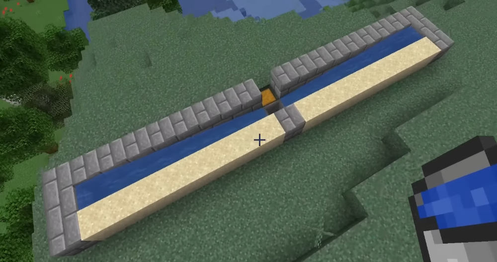 Next, I take stone brick blocks (because style matters!) and lay them as the foundation. From there, I measure eight blocks of sand in each direction — no shortcuts, we count out loud. The result is a nice long path where our future sugar empire will flourish. I make borders without fail — because water loves freedom, but here everything must follow my rules. I pour water into the corners, and this is where the aesthetic pleasure begins: the water flows beautifully, delighting the eyes.