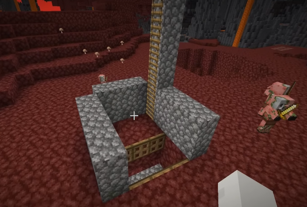 Next step — dig a pit. Size — 3x2, depth — three blocks. I decorated the bottom with cobblestone slabs (highly recommend for those who don’t want zombified piglins to accidentally reach you). Walls — cobblestone, you feel like an architect of a big city. The best part — placing trapdoors on the edges and watching legions of zombified piglins walk across your bridge of faith and crash down. The first dose of schadenfreude in Minecraft — free!