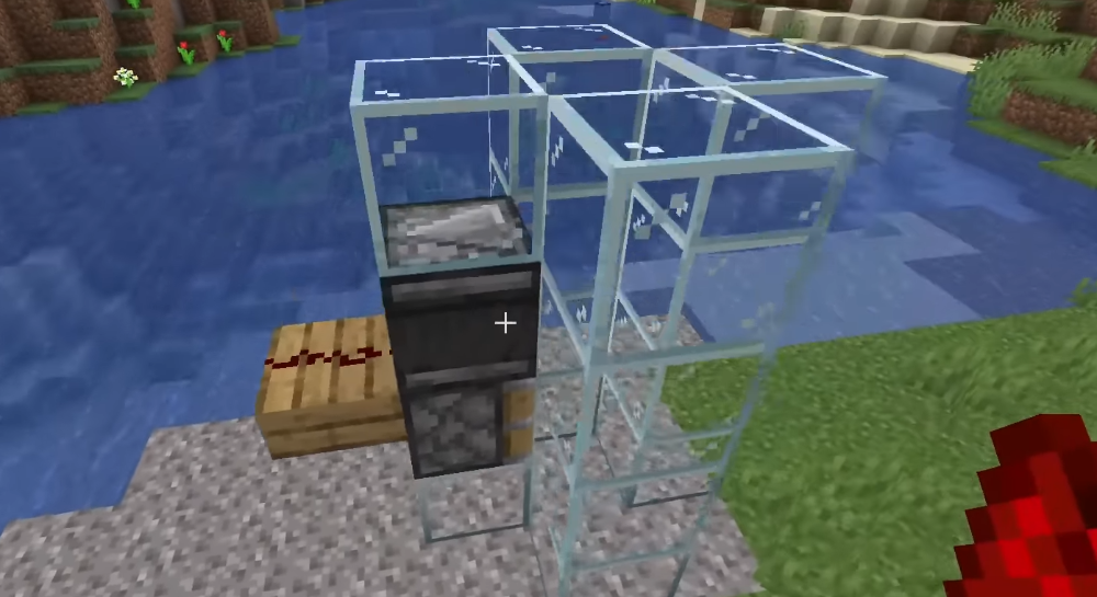 Place a piston facing upward on the glass, and right on top of it — an observer (its face looking up). What could be simpler? On top of the observer, attach another glass block — to hold the water and give the structure a futuristic look.