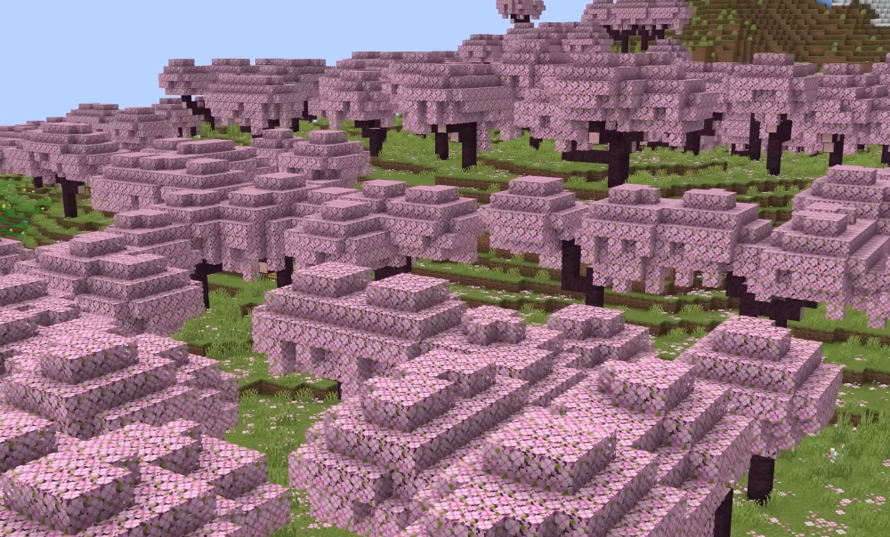 The landscapes of Minecraft have been enriched with the stunning cherry grove biome. These pink-hued locations offer a new type of wood: cherry. From it, players can craft a full set of building blocks in a soft pink shade, including planks, stairs, trapdoors, and hanging signs. Falling pink petals from the trees create a serene atmosphere and serve as a new decorative element.