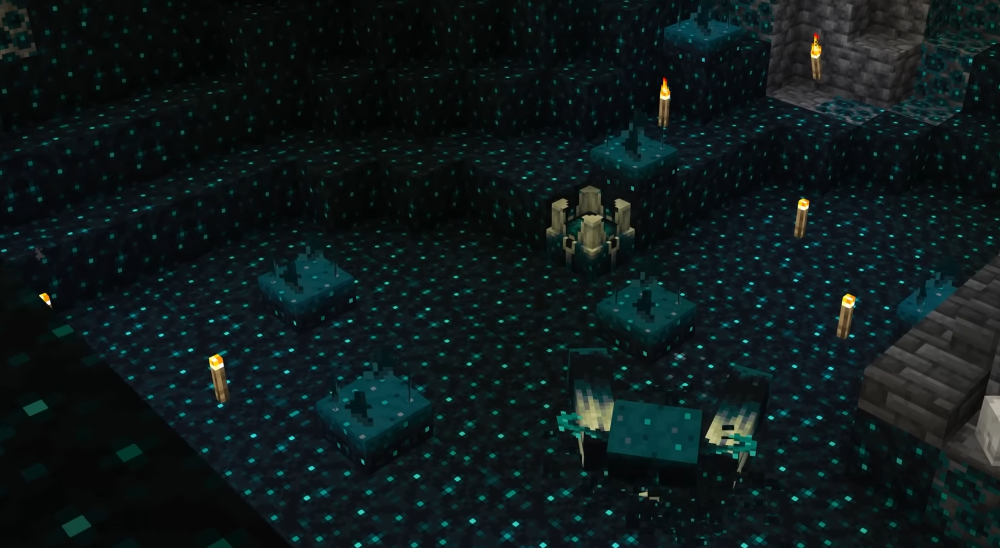 You won’t find the Warden on the surface or in regular caves. Its domain is the Deep Dark biome, located at the lowest altitudes (usually below Y=-50). This area is covered with skulk blocks, which absorb experience and react to vibrations.
