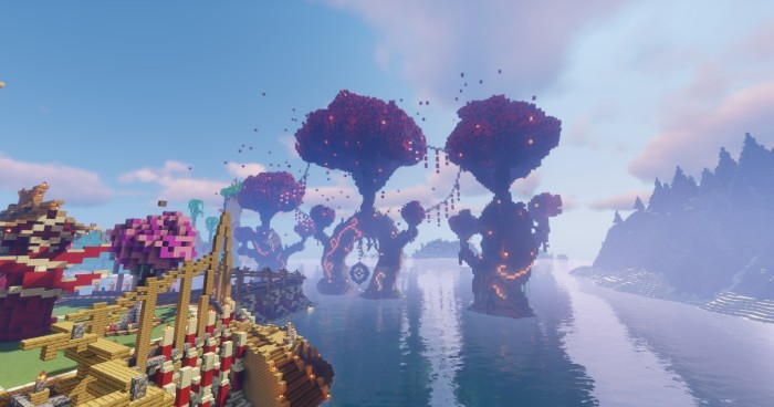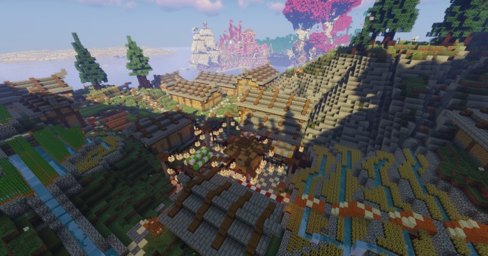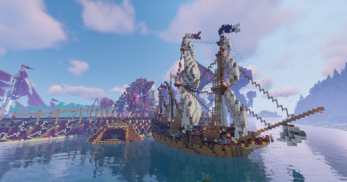 The The archipelago of dreams map is an interesting landscape and structure invented by the author for the Minecraft game. By itself, the map looks like a beautiful fantasy in the form of an island surrounded by the ocean. Nearby are medieval ships. So having examined the surrounding area, you will find yourself in a village with various buildings and structures. Quite an unusual and interesting project.