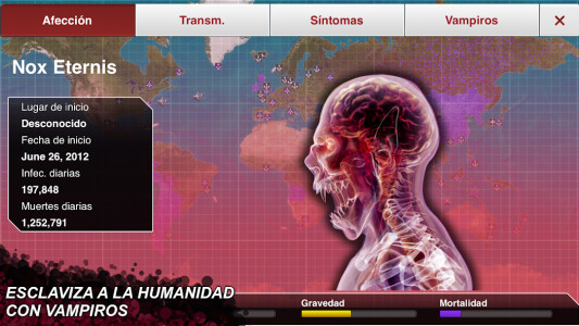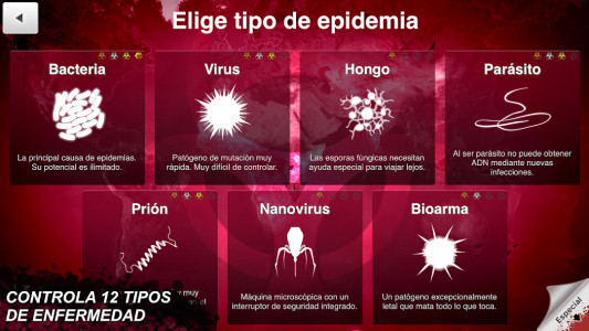Desarrolla un patógeno para lograr una mayor eficacia; crea nuevas enfermedades despiadadas a partir de gusanos que someten el cerebro a una cepa terrible que convierte a las personas en zombis ambulantes. Al mismo tiempo, tenga en cuenta matices como el clima, las medidas protectoras de los gobiernos, las mutaciones de su "creación", etc.