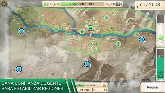 Rebel Inc no sólo ofrece una jugabilidad adictiva, sino también una impresionante inmersión visual en un mundo realista. Las regiones dañadas por la guerra cobran vida bajo tu control, creando una atmósfera única de construcción de posguerra.