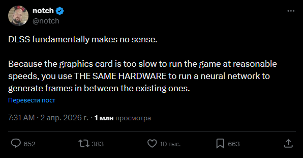 Markus «Notch» Persson, el creador de Minecraft, recientemente generó un acalorado debate entre los jugadores. En su cuenta de la red social X, criticó duramente la tecnología DLSS de NVIDIA. Según él, esta herramienta carece de sentido fundamentalmente. La declaración se difundió rápidamente en la red y provocó una activa reacción tanto de jugadores comunes como de especialistas técnicos, quienes se apresuraron a explicar al desarrollador cómo funcionan los procesadores gráficos modernos.