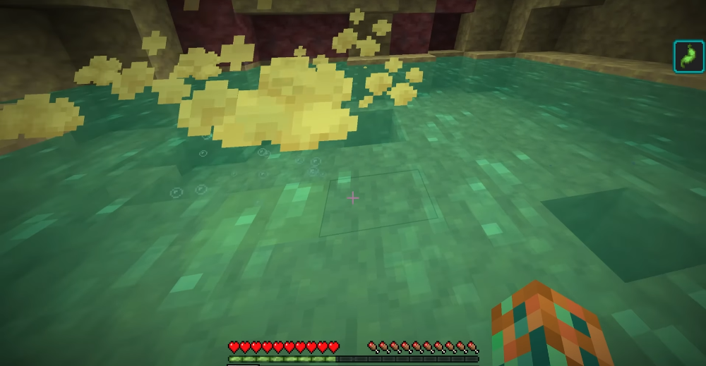 El uso más obvio — utilizar la fuente como punto de referencia. Si ves orillas amarillas y agua burbujeante, toma tu pico y cava hacia abajo. Allí encontrarás amplias cuevas de azufre, nuevos depósitos de recursos y mobs únicos — los cubos de azufre.