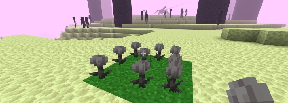 Très bien, me dis-je, peut-être que les Endermen les motiveront ? Je saute dans le portail, attrape les fleurs et les plante sur une des plateformes flottantes de l’End. Une pensée me traverse : « Le miracle arrive ». Mais non : rien ne se passe ; les œilflors restent en bourgeons tristounets, et autour — seulement le vide et des Endermen silencieux. Entre nous : à ce moment-là, j’ai même commencé à parler aux plantes — tout pour le contenu !