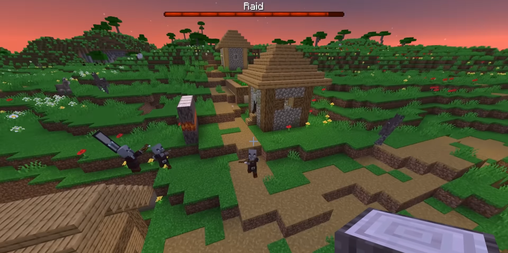 - Les villageois — cobayes de l’expérience : Là, ça m’a vraiment touché ! Pendant que le mob et les pillards jouent à « qui a le plus peur », les villageois perdent leurs maisons gaiement. Pas de vraie couverture, le raid suit son cours. Même mon Golem regarde la scène avec une légère surprise.