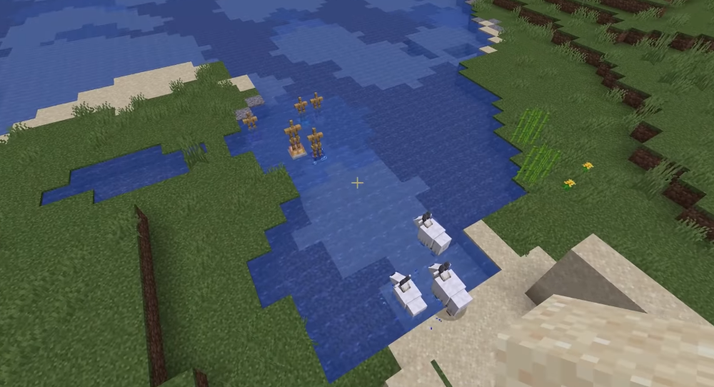 Je me pose toujours des questions du genre : « et si…?» Et voilà — la classique première pensée : « Et si ça marchait ?» L’un des héros principaux de cette expérience est l’enchantement “Marcheur de Givre” (Frost Walker). C’est comme un conte de fées où de la glace apparaît sous vos pieds dès que vous marchez sur l’eau. Le deuxième héros est une chèvre têtue de Minecraft, toujours prête à donner un coup de tête énergique à n’importe quoi — que ce soit vous, une poule ou un support d’armure.