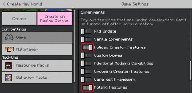 काम करने के लिए मॉड के लिए, आपको मैप सेटिंग में प्रायोगिक विकल्पों को सक्षम करना होगा