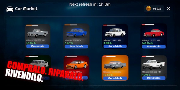 Dopo un acquisto riuscito, inizia la vera magia. Il tuo laboratorio diventa un’officina alchemica dove i rottami arrugginiti si trasformano in opere d’arte. Il sistema di riparazione del gioco impressiona per il livello di dettaglio — dalla sostituzione di singoli bulloni alla riverniciatura completa della carrozzeria.