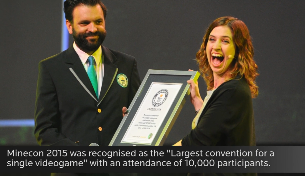 La principale ragione di questo record è stata la serie di convention ufficiali MineCon (successivamente rinominate Minecraft Festival e Minecraft Live). Il record assoluto è stato stabilito il 4 luglio 2015 a Londra, quando al MineCon si sono riuniti 10.000 fan di Minecraft da tutto il mondo. Ciò che è iniziato come un modesto incontro di appassionati si è rapidamente evoluto in uno spettacolo grandioso.