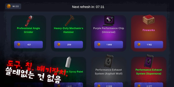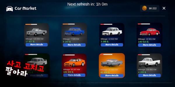 손상 물리학은 현실감으로 감탄을 자아냅니다 — 각 긁힘, 찌그러짐 또는 부식 얼룩이 자동차의 가치에 영향을 미칩니다. 사운드 효과는 매우 정확하여 경험 많은 플레이어는 실제 정비사처럼 소리만으로 엔진 문제를 진단할 수 있습니다.