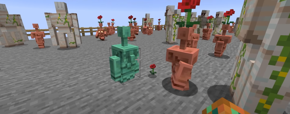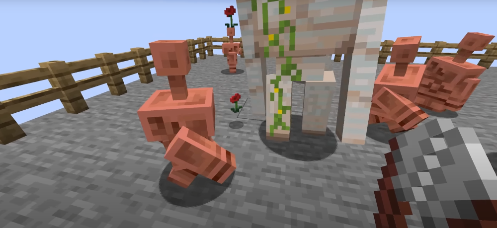 이 순간 저는 온갖 감정을 경험했습니다. 제 «관찰 지점»에 앉았어요 (네, 흙 블록 위에요, 뭐 어때요? 과학적인 접근 방식이잖아요!), 그리고 지켜봤습니다… 아무 일도 없었어요. 철 골렘들은 조용히 원을 그리며 걸어 다니고, 구리 골렘들은 쉬는 시간의 아이들처럼 뛰어다녔습니다. 조금 실망했어요 — 마법은 어디에 있는 거죠? 그런데 갑자기! 한 철 골렘이 멈췄습니다. 잠시 동안 저는 세기의 대결이 벌어질 거라고 생각했지만, 아니었어요. 그는 구리 골렘 쪽으로 몸을 돌리고, 손을 내밀더니… 제 눈이 툭 튀어나올 뻔했어요! 꽃! 바로 안테나 위에! 솔직히 말해서, 이건 «첫 시도에 엘리트라를 얻는 것»만큼이나 놀랍고 감동적이었습니다.