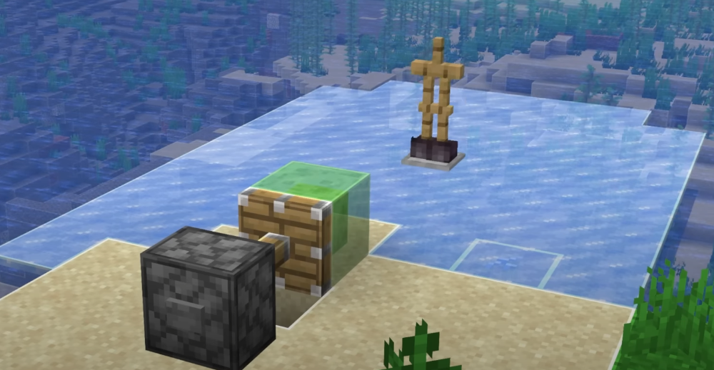 첫 생각은 이랬죠: “이건 안 될 거야, 거치대는 그냥 오브젝트잖아.” 하지만 손은 이미 레버로 갔습니다. 딸칵! 피스톤이 작동해 슬라임 블록을 밀었고, 그 힘으로 거치대가 물 위로 “출항”했습니다.