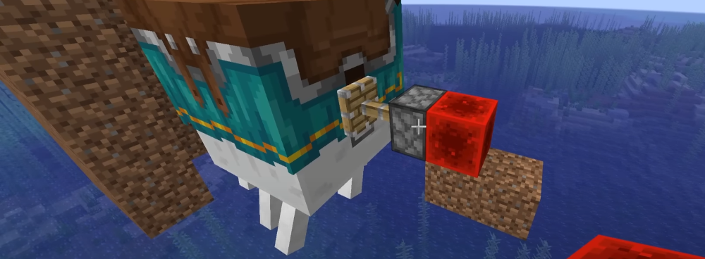 그다음은 간단합니다. 일반 점착 피스톤을 벽에 딱 맞춰 두고, 밀릴 블록이 지금 가스트의 일부가 차지한 공기 칸으로 정확히 들어가게 정렬합니다. 곁엔 출격 대기 중인 돌 블록. 시스템 준비 끝, 관객(닭과 양)은 숨을 죽였습니다.