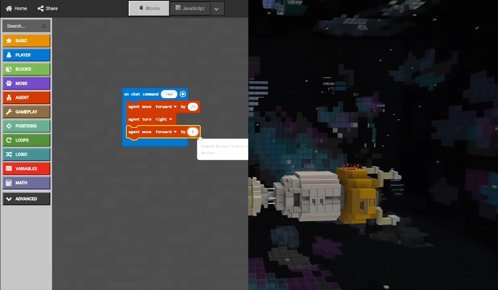 이것은 교육용 버전의 가장 강력한 기능 중 하나입니다. Code Builder 도구를 사용하면 플레이어가 게임 중에 직접 코드를 작성할 수 있습니다. Scratch와 같은 블록 기반 프로그래밍과 Python 및 jаvascript 언어가 지원됩니다. 몇 줄의 코드를 작성하면 가상 로봇 에이전트가 거대한 벽을 건설하거나, 광산을 파거나, 수학 퍼즐을 해결하도록 할 수 있습니다.