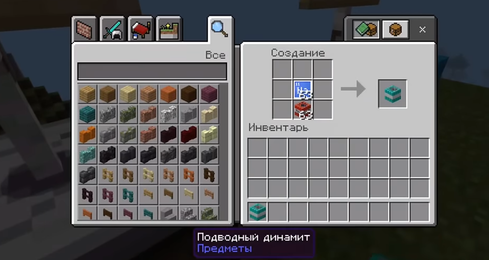 일반 작업대를 열고 나트륨 블록을 TNT 블록 바로 위에 배치하세요. 결과적으로 수중 다이너마이트를 얻게 됩니다. 외관상으로는 파란색 리본과 «TNT»라는 글씨로 클래식 TNT와 구별됩니다.