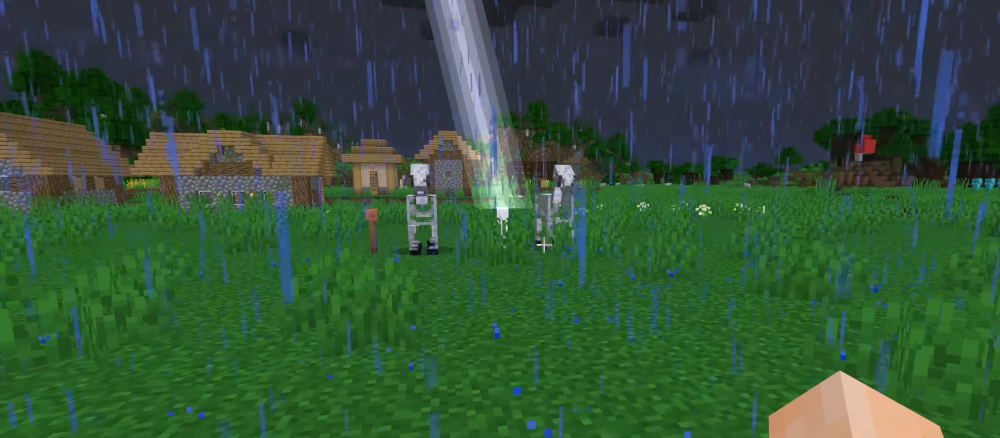Powiedzmy sobie szczerze — pomysł był ryzykowny, ale eksperyment uznajemy za nieudany. Teraz już wiadomo: pułapka-szkielet w Minecraft działa zupełnie inaczej. Aby się aktywowała, potrzebna jest nie tylko burza i koń, ale specjalna “przynęta”, która pojawia się losowo podczas burzy. “Zwykły” koń-szkielet i piorunochron nie mają tu nic do rzeczy. Piorun efektownie uderza, ale niczego nie uruchamia, poza moim rozczarowaniem.