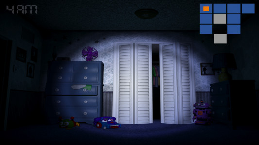 Ao se movimentar pelos quartos, você abrirá portas, armários e também olhará embaixo das camas. Ao ouvir sinais da presença de brinquedos ameaçadores, você precisa sair urgentemente desta sala ou fechar as portas abertas.