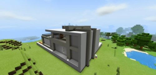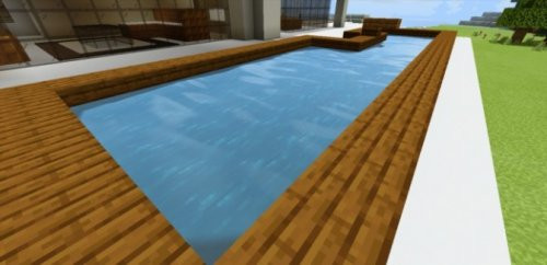 Neste mod, você conhecerá uma charmosa villa equipada com pedra vermelha. Esta oportunidade é fornecida pelo cartão Redstone Villa - esta é uma villa Art Nouveau combinada com redstone. Vamos dar uma olhada de fora primeiro. O exterior é muito apresentável com piscina e quadra de badminton. A área é feita de concreto branco, que está em harmonia com os largos degraus de madeira marrom, também das tábuas que emolduram a piscina e a quadra de badminton. Você não poderá jogar, mas o playground se tornou uma decoração digna da vila. Para o edifício em si, foi utilizada uma combinação de concreto branco e cinza.