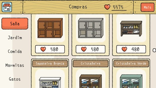 - Jardim: ao desbloquear o jardim, você não apenas amplia o espaço disponível, mas também atrai diferentes animais visitantes para sua casa. Eles virão visitá-lo se você colocar itens especiais no jardim, e pelas visitas você receberá corações extras.