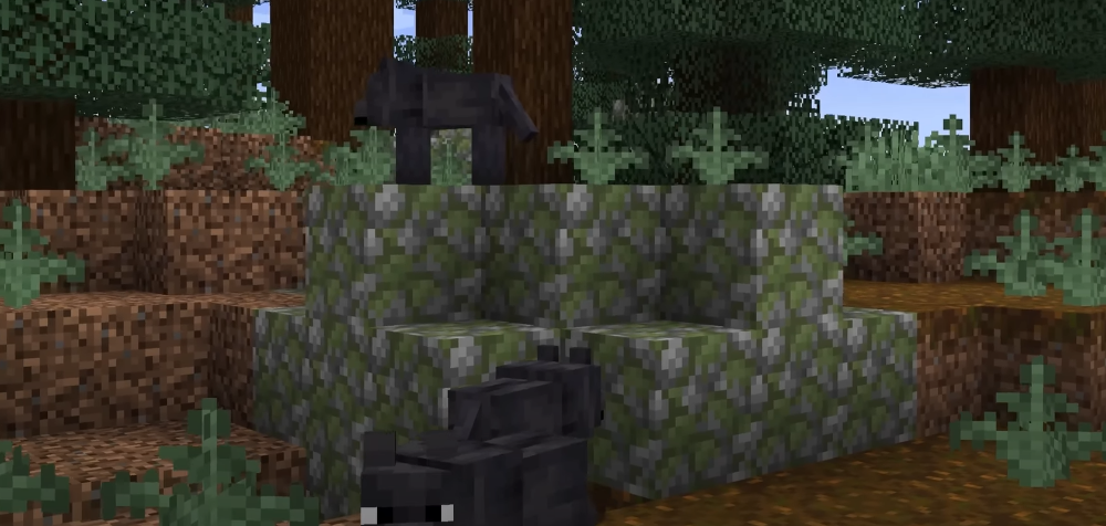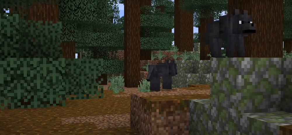 Agora, a busca. Já sabia que o lobo negro não é famoso por ser dócil. Ainda mais depois de Rusty e Spotted, pensei — “esse vai me divertir com certeza!”. A sensação quando finalmente topei com aquele focinho escuro no fundo do pinhal! Clima de thriller: sombras, galhos e os sentidos no limite. Procurar o lobo negro no Minecraft — é outra canção e, juro, minha ária favorita na ópera da coleção.