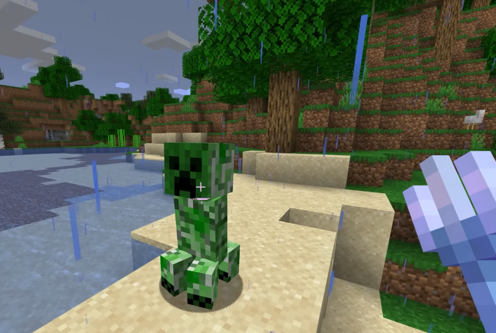 É aqui que fica interessante! Começa a garoa, clima de laboratório, e eu no auge da empolgação. Primeiro golpe — o creeper não cai, segundo — ainda de pé, terceiro — finalmente. De novo três! Pensei: talvez mais água ajude? Enfiei o coitado numa poça, testei de novo — e outra vez três. Quase perdi o chapéu de surpresa. Cadê o tal bônus mágico?!