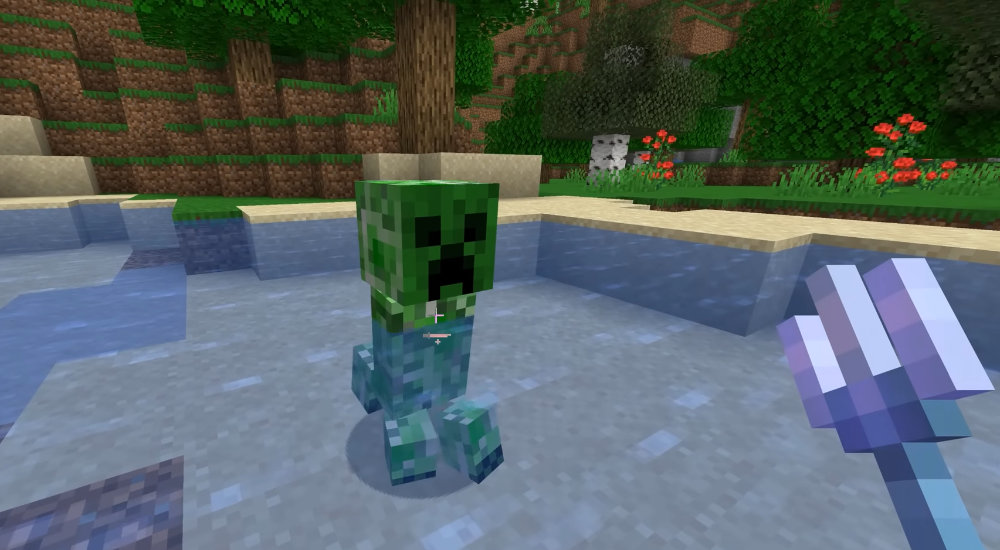 Peguei meu tridente encantado e confirmei “Empalar” no máximo. Vamos lá! De cobaia escolhi o creeper — bola de golfe verde que adora explodir experimentos. Quantos golpes em clima normal? Resposta: três. Beleza, espero a chuva.