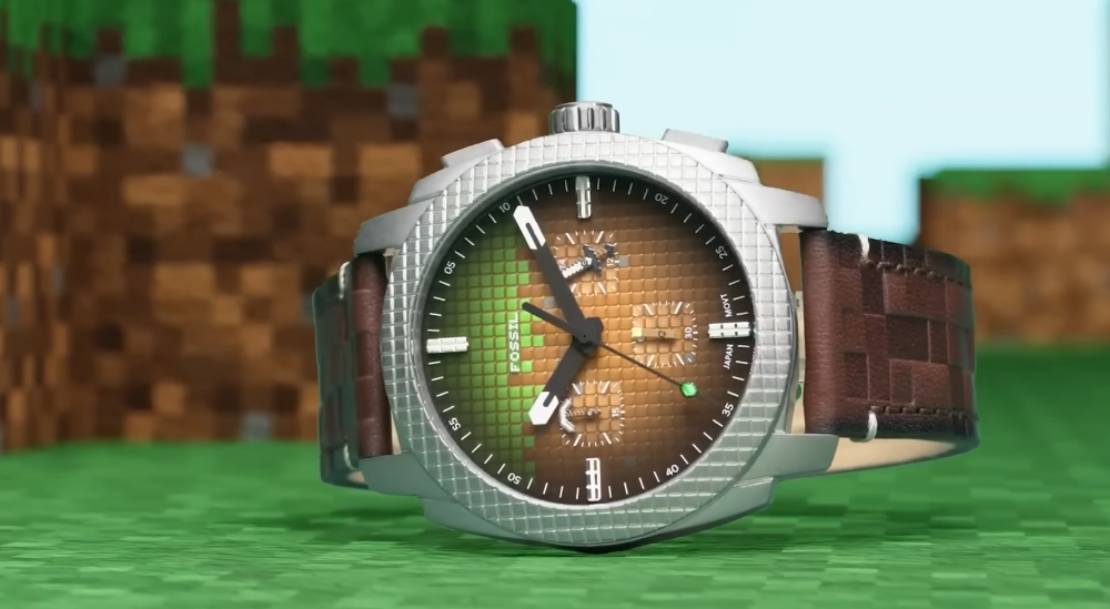 Limited-Edition Grass Block Chronograph Watch: Este relógio é dedicado aos primeiros passos do jogador no mundo de Minecraft. O mostrador e o aro superior têm uma textura que lembra um bloco de grama, enquanto a pulseira de couro natural é decorada com gravações pixeladas. Um detalhe especial — os pequenos ponteiros do cronógrafo são projetados como ferramentas de ferro (picareta e espada).