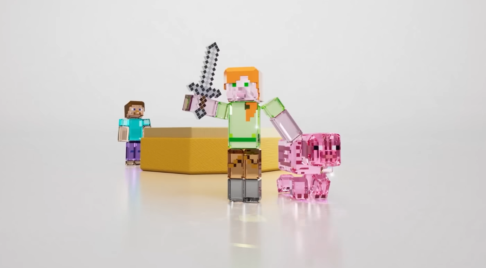 - Steve e Alex: Os protagonistas do jogo estão congelados em poses dinâmicas. Steve, armado com sua fiel picareta, está pronto para minerar recursos, enquanto Alex segura uma espada, como se esperasse uma batalha contra zumbis. Essas figuras têm até 9 centímetros de altura, e o uso de cristais de diferentes tons reflete perfeitamente suas skins clássicas.