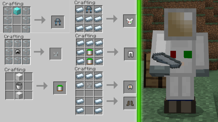 Em seguida, você precisa transcender para a criação de uma armadura protetora: será útil se você não quiser morrer logo no início de sua jornada para outros mundos. Veja a foto abaixo para equipamentos.